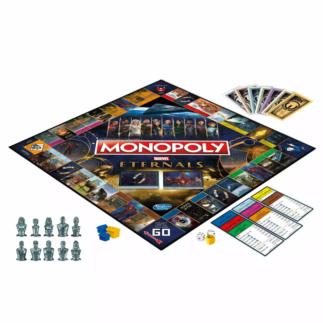 - MONOPOLY GAME: MARVEL STUDIOS’ ETERNALS EDITION: This edition of the Monopoly board game features an Eternals themed gameboard, cards, tokens, and gameplay
