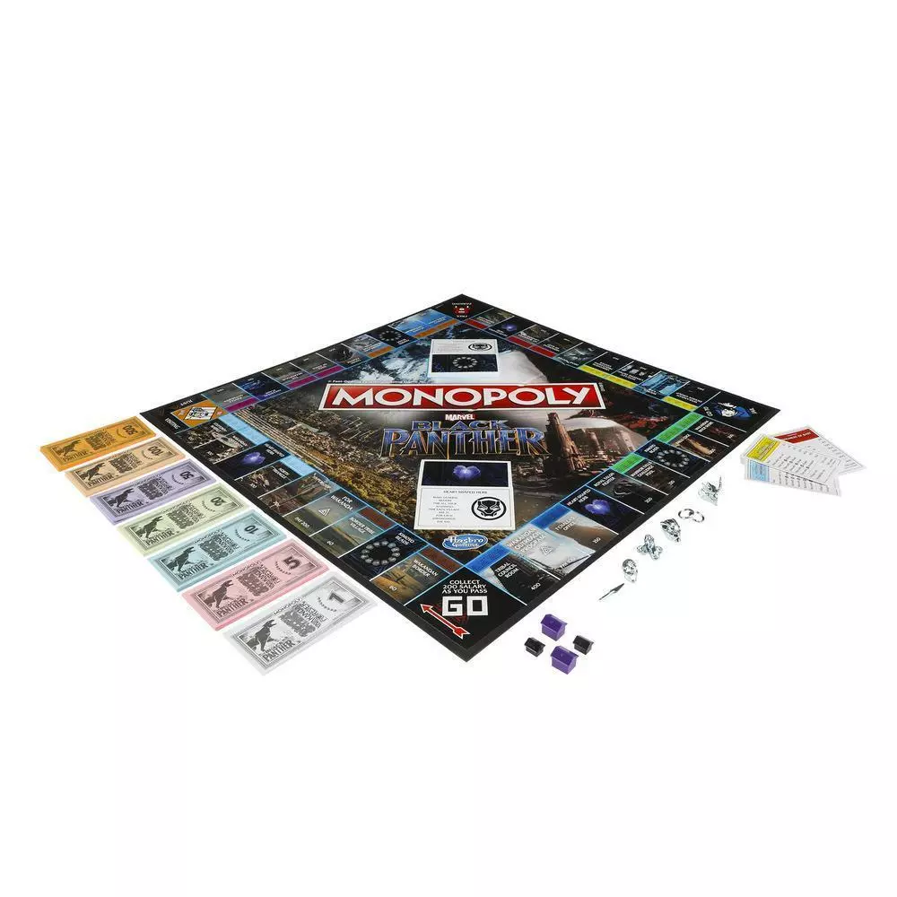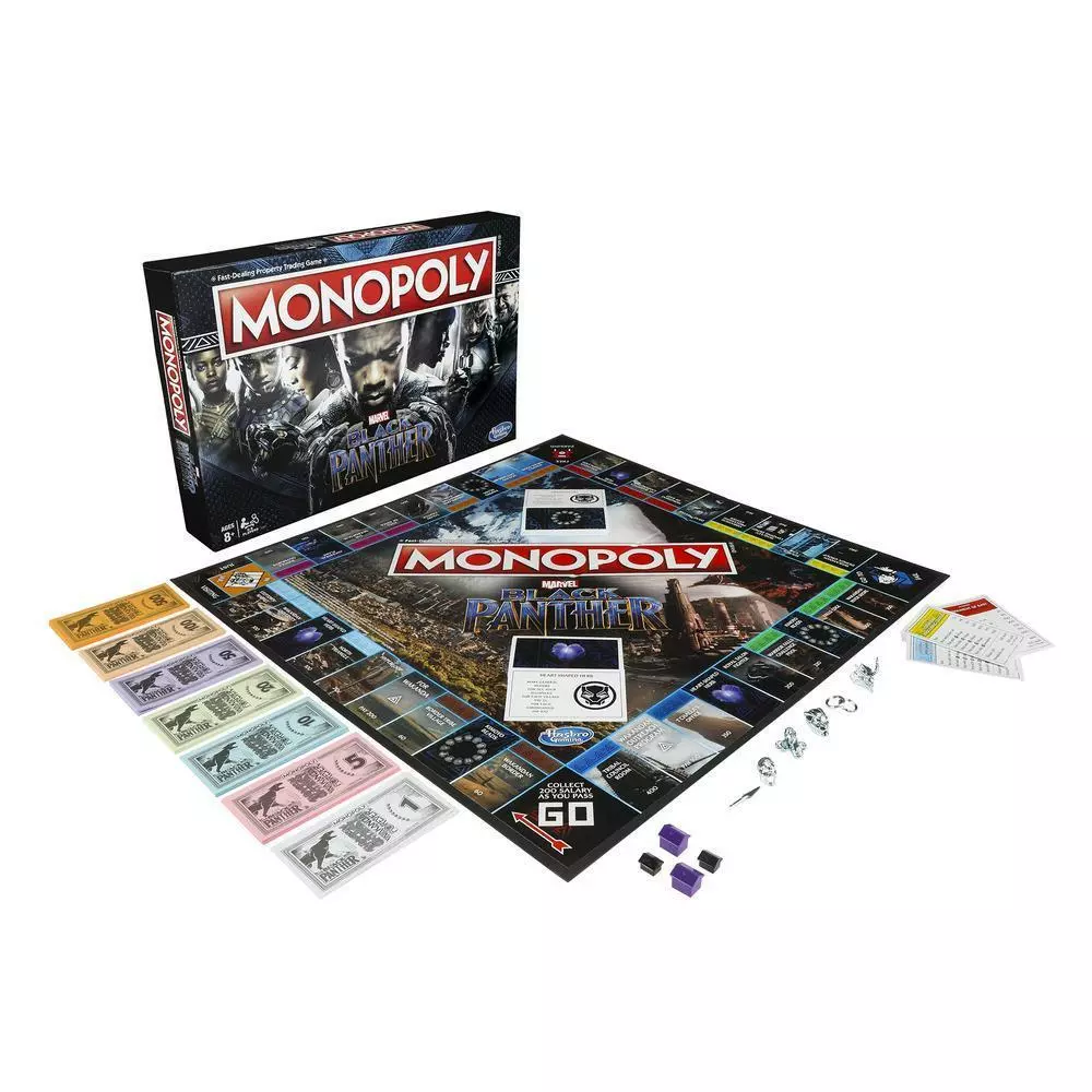 From the Warrior Falls Challenge Pool, to the Hall of Kings, to the Tribal Council Room in the Golden City, this Edition of the Monopoly game features locations and themes inspired by Marvel’s Black Panther. Players can imagine exploring beautiful Wakanda with T’Challa and his people as they move around the board trying to make as many Alliances as they can. Build Villages and Strongholds, and make moves directed by the Kimoyo Beads cards and Heart-shaped Herb cards. The last player with money when all other players have gone bankrupt wins.