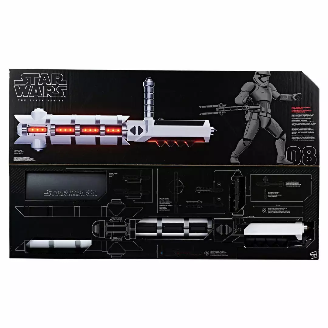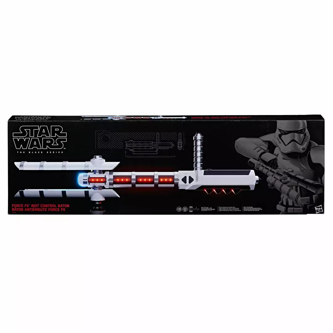 Imagine wielding the electrifying power of the First Order Riot Control Stormtrooper with the Force FX Z6 Riot Control Baton from Star Wars The Black Series, modeled after the weapon from Star Wars: The Last Jedi. A true-to-story replica of one of the weapons of the First Order Stormtroopers from Star Wars: The Last Jedi, this authentically-designed Z6 Riot Baton is complemented by a real metal handle and flip-to-activate mechanism for full baton extension. The Force FX Z6 Riot Baton also features authentic movie sound effects, a vibrating motor on the baton handle, and a stand for display. Additional products each sold separately. Subject to availability.