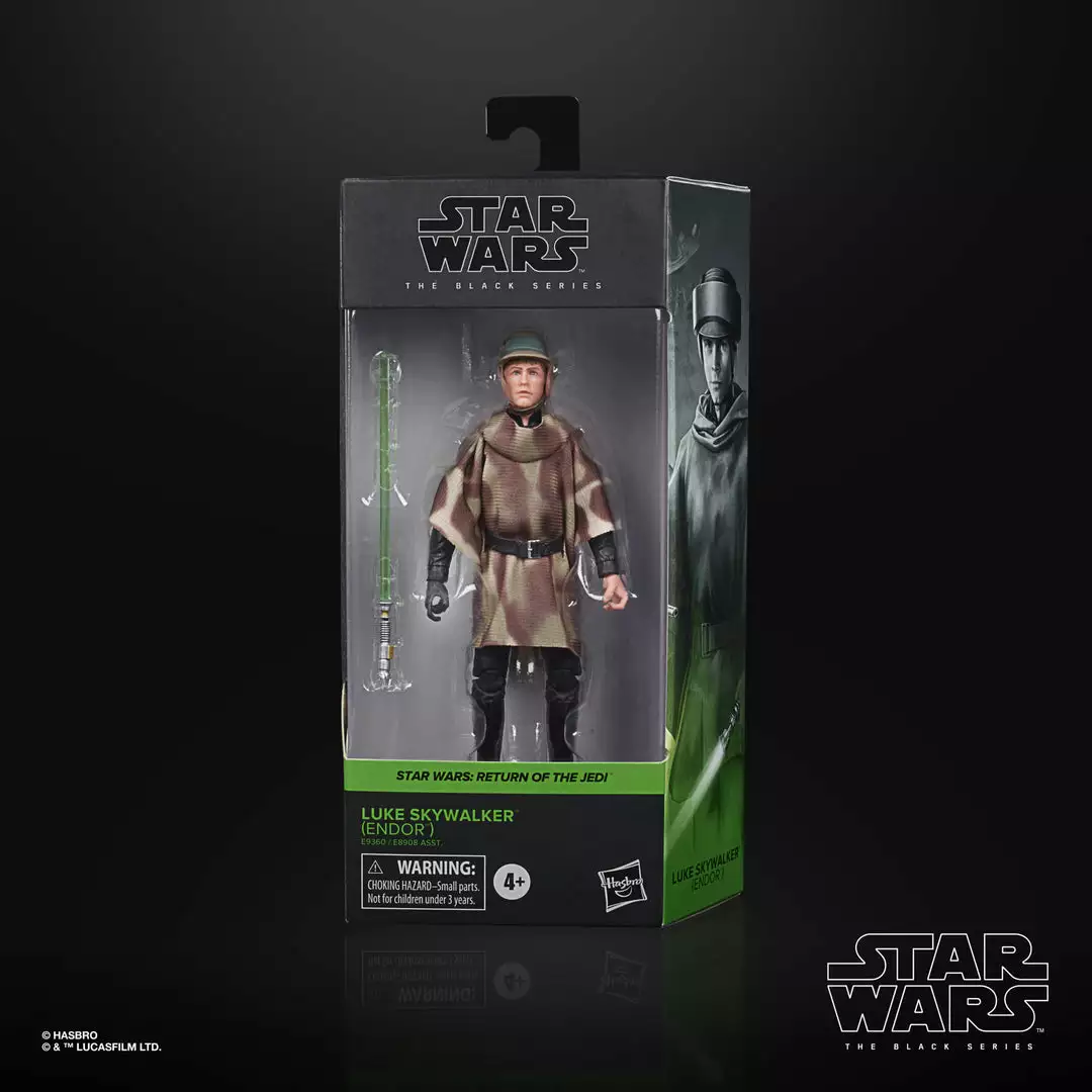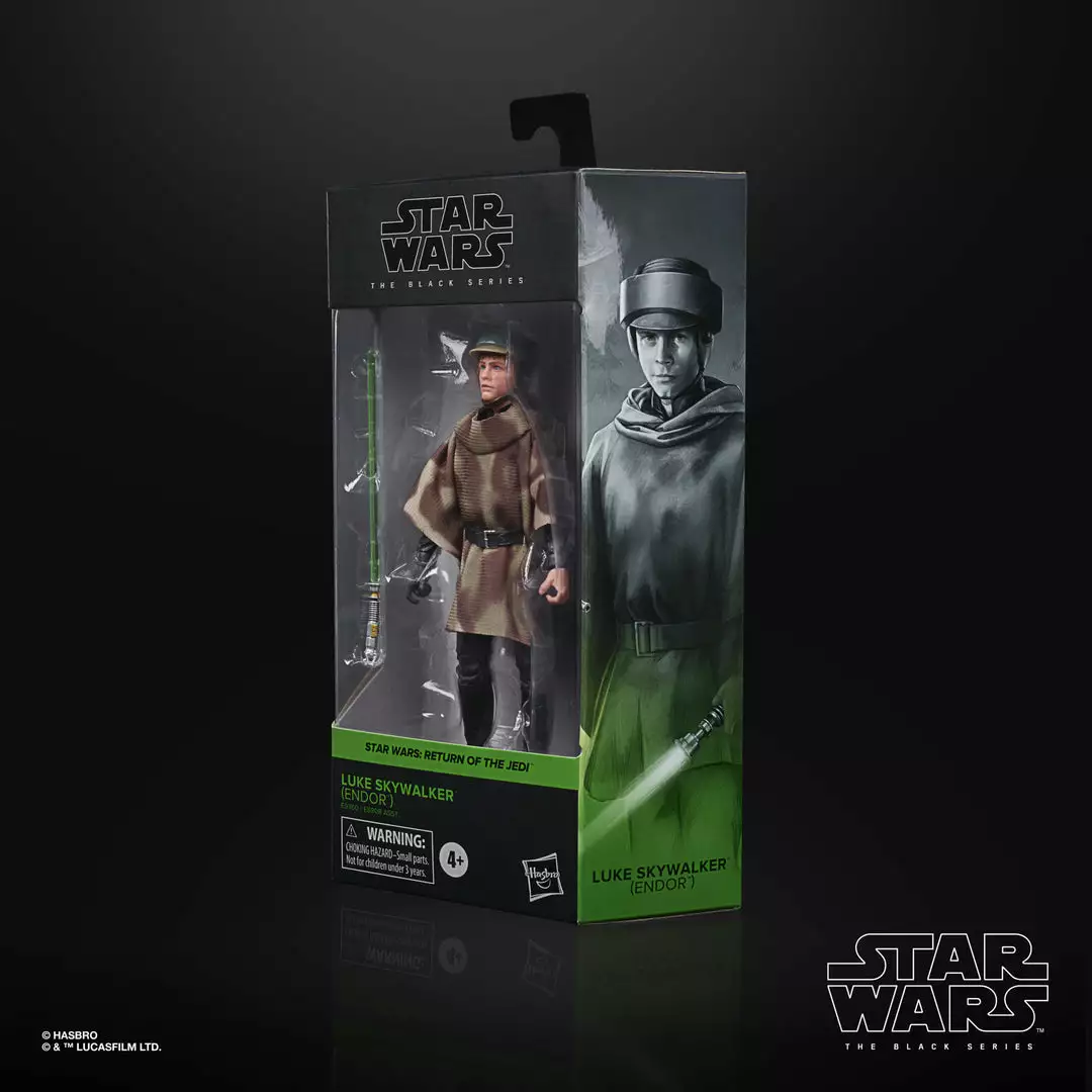 The 6-inch scale Black Series figure is detailed to look like the Luke Skywalker (Endor) character from Star Wars: Return of the Jedi, featuring premium detail and multiple points of articulation.