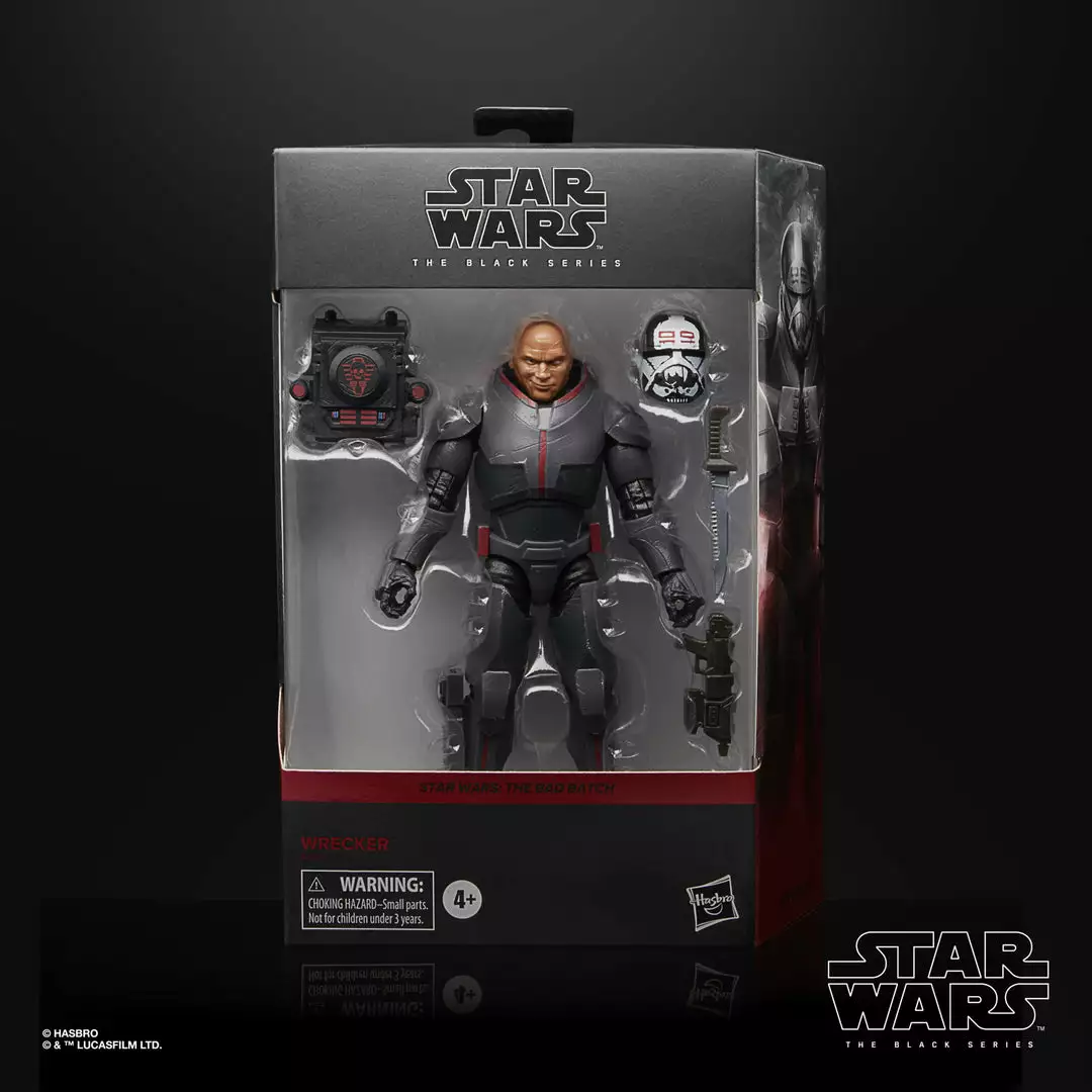 The 6-inch-scale The Black Series Wrecker deluxe figure is detailed to look like the character from Star Wars: The Bad Batch, featuring premium detail and multiple points of articulation.