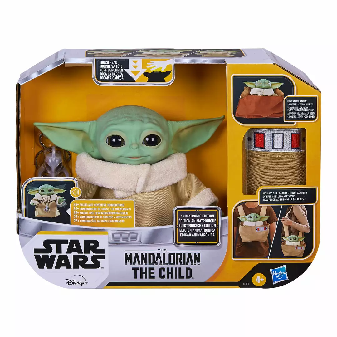 Now you can become the protector of The Child, also affectionately known to fans as “Baby Yoda,” with this animatronic toy from Star Wars. Touching the top of The Child Animatronic Edition’s head activates over 25 sound and motion combinations, including happy and excited sounds, giggles, babbles, and more, all while the figure’s head moves up and down, ears move back and forth, and eyes open and close. Boys and girls ages 4 and up can pretend to harness the power of the Force as The Child toy closes its eyes, raises its arm, and sighs as if exerting a great amount of energy. Includes a 3-in-1 carrier that can be worn on the chest or over the shoulder and converts into a sleeping blanket.
