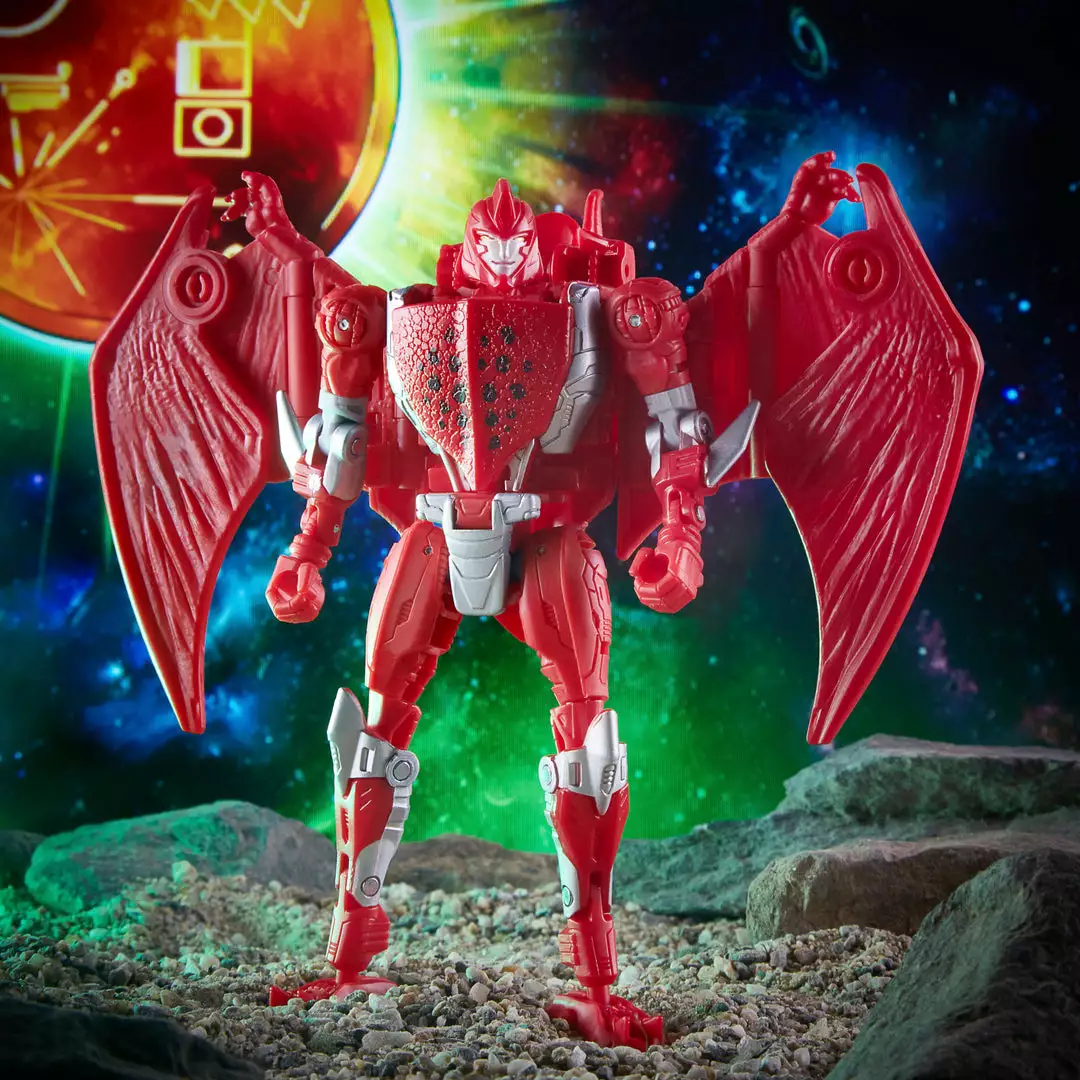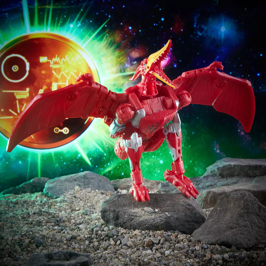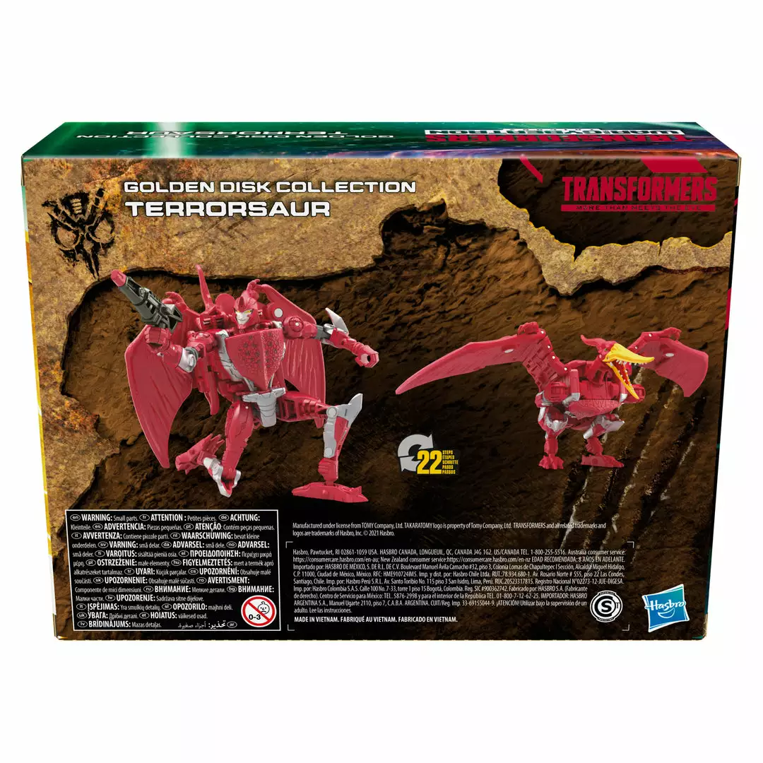 - Terrorsaur figure converts to pterodactyl mode in 22 steps. Includes Golden Disk (Voyager) and blaster accessories