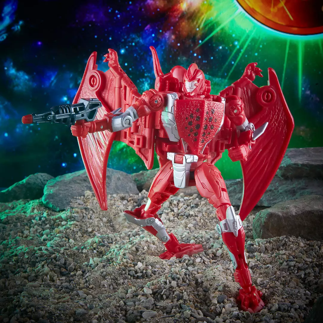 Terrorsaur figure converts to pterodactyl mode in 22 steps. Includes a Golden Disk (Voyager) accessory and his blaster accessory.
