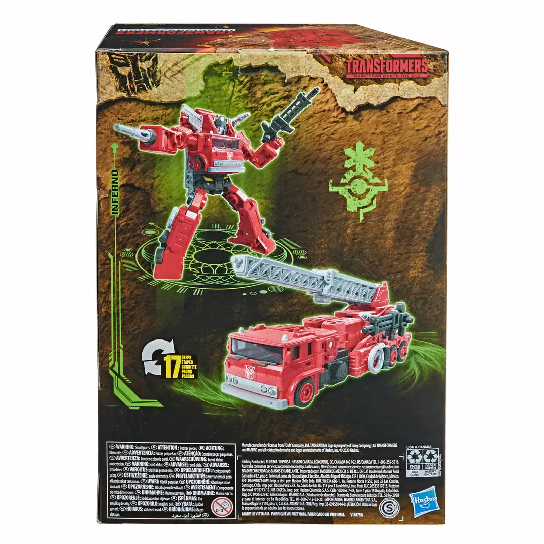 Includes Transformers Generations War for Cybertron: Kingdom Voyager Class Inferno figure, accessory, Golden Disk card, and instructions.