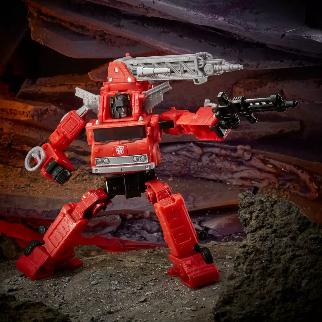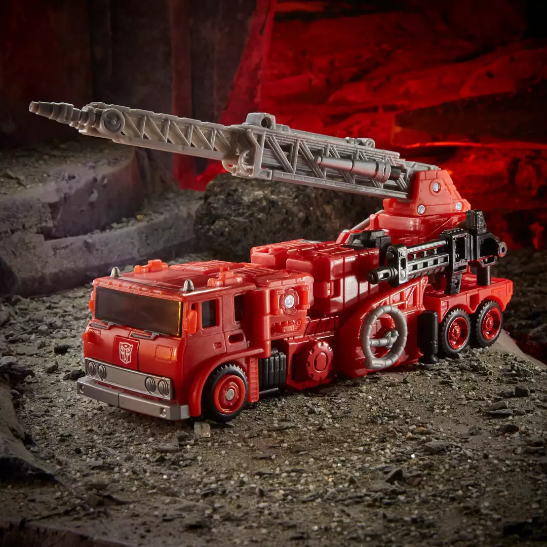 - Comes with classic G1-inspired extinguisher blaster accessory and features an extendable, ratcheting ladder