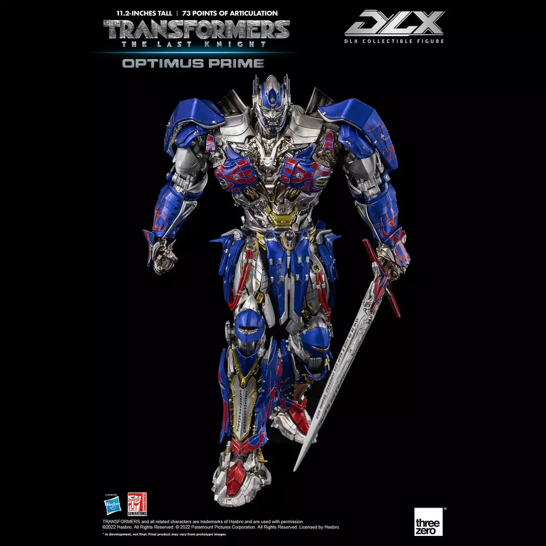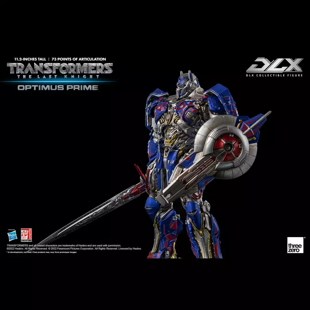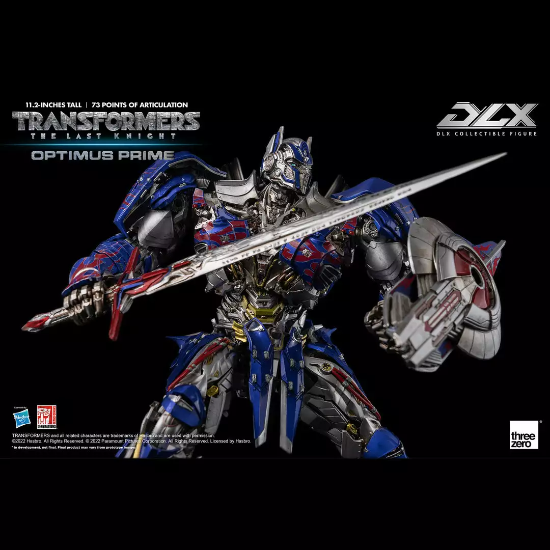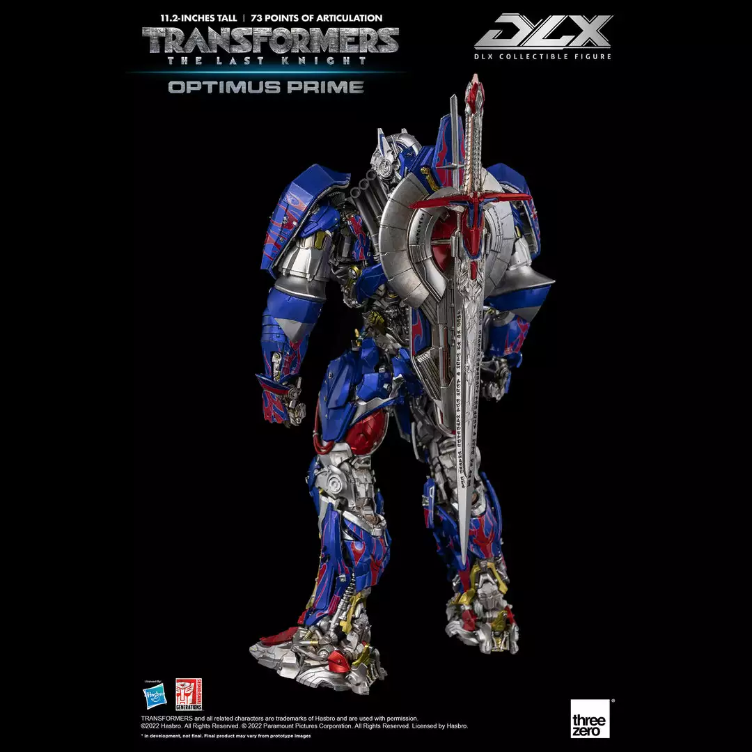 Transformers: The Last Knight – DLX Optimus Prime is approximately 11.2 inches (28.5 cm) tall and features approximately 73 points of articulation, with a die-cast metal frame, and LED illuminated eyes.