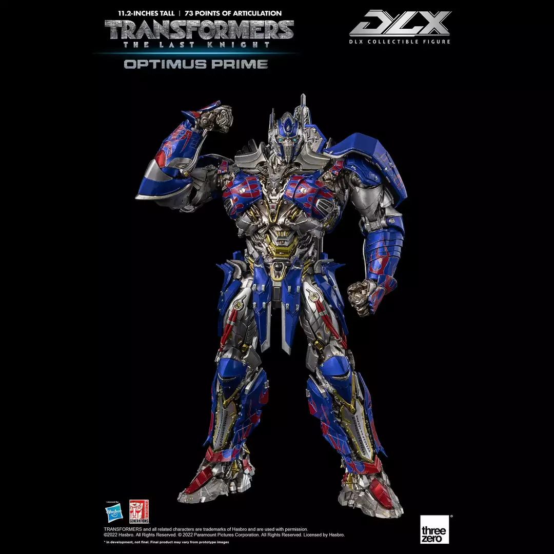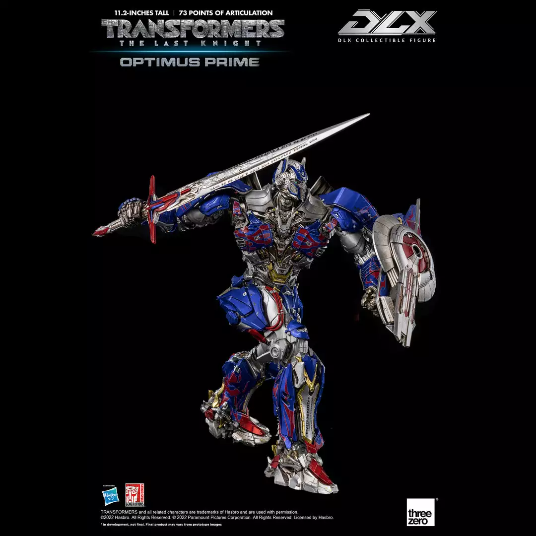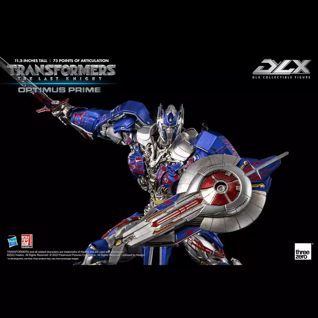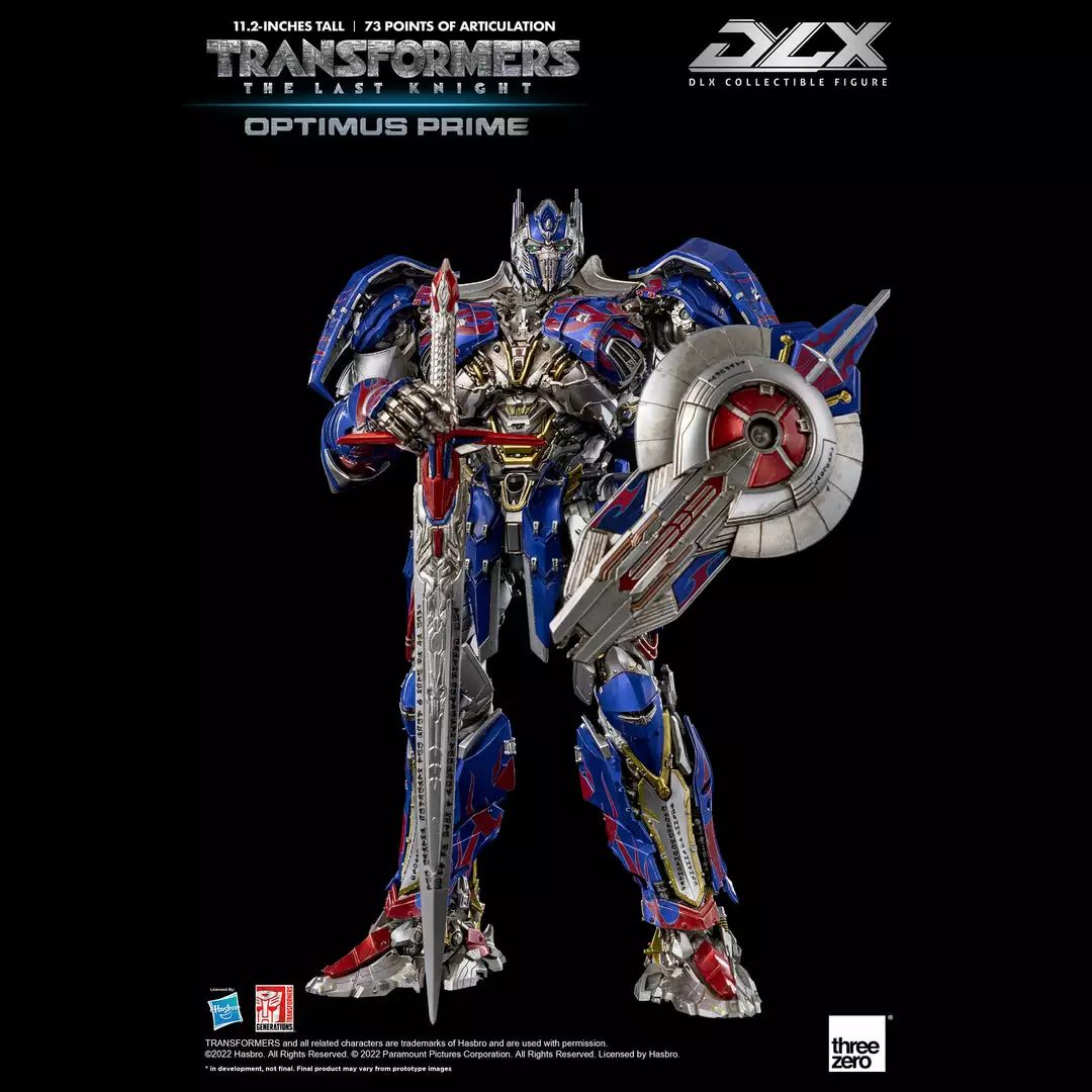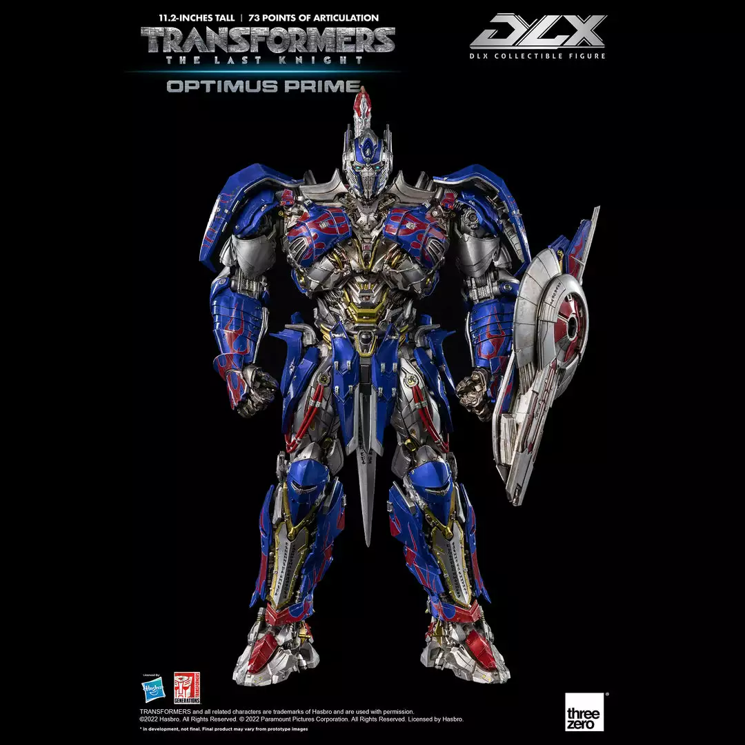 Transformers: The Last Knight – DLX Optimus Prime is approximately 11.2 inches (28.5 cm) tall and features approximately 73 points of articulation, with a die-cast metal frame, and LED illuminated eyes.