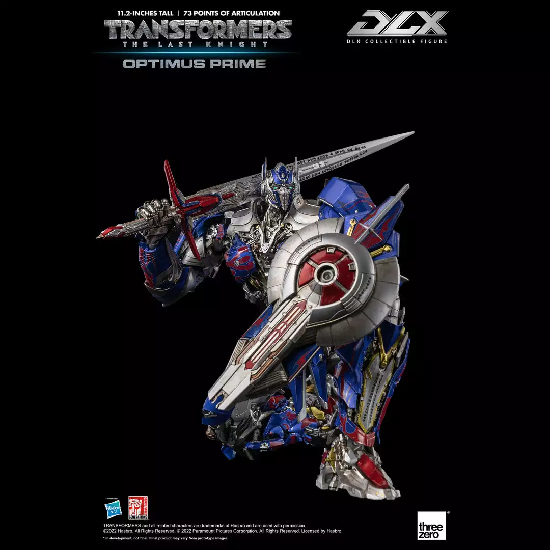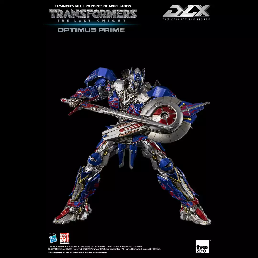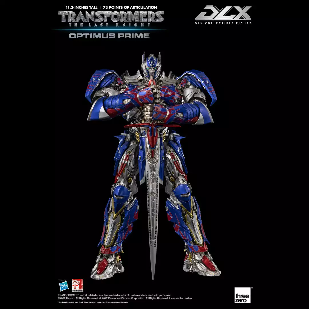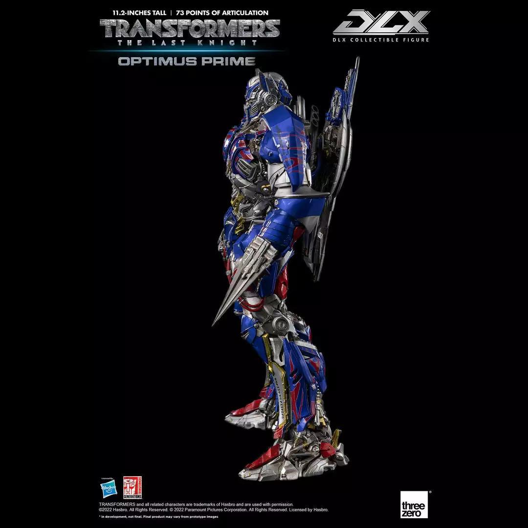 Transformers: The Last Knight – DLX Optimus Prime is approximately 11.2 inches (28.5 cm) tall and features approximately 73 points of articulation, with a die-cast metal frame, and LED illuminated eyes.
